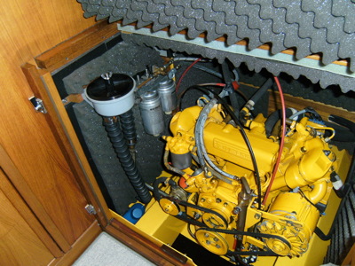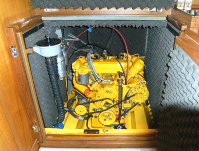 Der Motorraum ist an fünf Seiten schallisoliert. Zusammen mit der soliden Ausführung des salonseitigen Zugangs führt das bei Motorfahrt zu einem äußerst niedrigen Geräuschpegel. Das Schiff wird über eine Drucklagerwelle angetrieben. Zwischen Wellen- und Getriebeflansch befindet sich eine hochflexible »VULKAN-MEGIFLEX«-Kupplung. Die Stopfbuchse ist wassergeschmiert, das propellerseitige Gummilager ebenfalls. Dort ist die VA-Welle hartmetallbeschichtet und damit wartungsfrei. Ein SPW-Drehflügelpropeller aus Bronze bringt die Kraft des Motors ins Wasser. Für Service-Arbeiten sind Motor und Welle von allen Seiten gut erreichbar. |